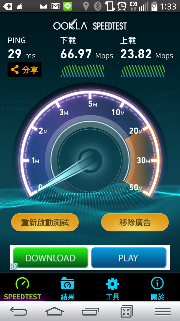 7,8,9月,中華電信的4G大爆發..10,11,12連相當偏僻的小村落或山區,也會陸續完成4G基地台的建置....預定年底前2G的900MHZ會轉為4G.....我家離台南市佳里區鎮集約4.5K,看情況預定下個月會開台....不過,不期待,因為家用WIFI穩定快速,PING值又低許多.....比較期待FTTH,能夠直升300M...公司門口,一樓室內,二樓 陽台,都破百;六樓室內座位上大多8XM,地下室一樓6XM...因為公司的電腦,有一些限制,所以有時會用手機上網..........