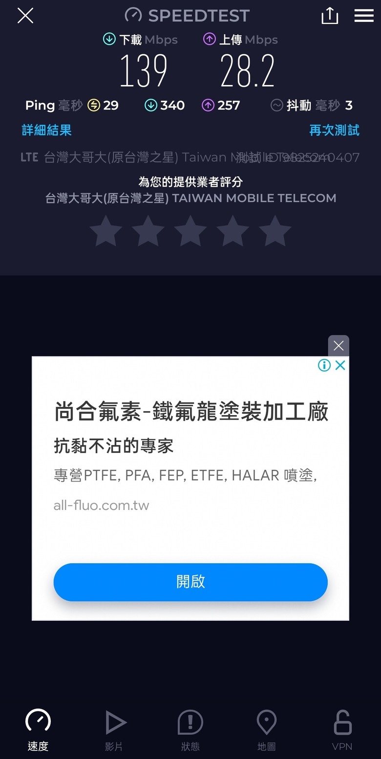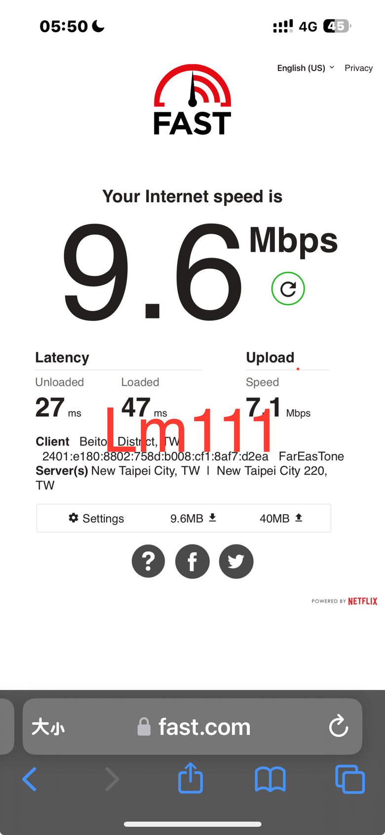 這幾天發現,賴傳訊息💬很慢,都會出線箭頭,等一下才正常,切去遠傳訊號,就正常,賴打字出去,就不會感覺停頓有出現箭頭,看起來不是下載速度快就好,我這兩門後,剛好是台星188/Lm111, 限速10m的111,速度不快,但是穩定,Ts真的要加油了