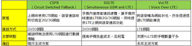 大家現在常聽到的4G LTE網路,是以全IP網路封包交換(PS:Packet Switching)方式進行數據傳輸,無法向下相容GSM、UMTS和CDMA 2000這些2G/3G網路所使用的電路交換(CS:Circuit Switched)語音傳輸架構。因此,在4G LTE網路中,為了要能提供語音通話服務,電信營運商會利用CSFB(Circuit Switched Fallback)、SGLTE(Simultaneous GSM and LTE)方案,使用2G/3G網路來提供語音通話服務。