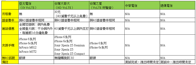 目前台灣五家電信營運商中,有三家開始提供VoLTE服務。至於每家電信營運商提供VoLTE服務現況,自己簡單整理出這張表格,但或許會有資訊錯誤情況發生,如有朋友發現,也請不吝update,讓有興趣的人能觀看到最正確的資訊。