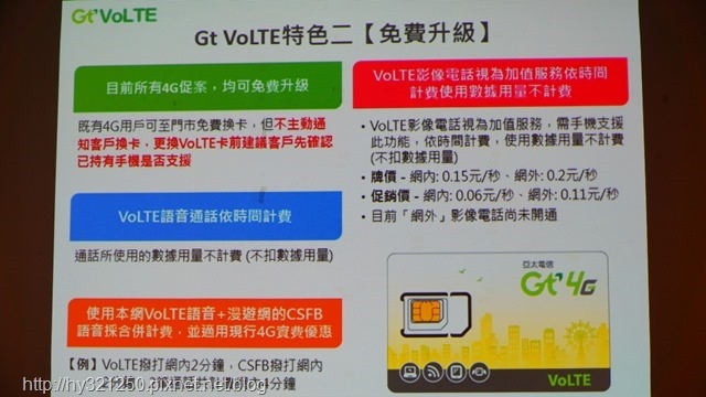 亞太電信Gt VoLTE服務的第二個特色,只要使用者確認自己的手機型號是Gt VoLTE服務有支援的,且是4G用戶,就能到門市免費換卡升級。費率部分,除了不用月租費,語音通話部分費用則跟使用者自己目前使用的4G資費完全相同,網內影像通話部分,目前則有每秒0.06元的促銷價。而不管是語音通話或網內影像通話所使用的數據傳輸用量,都不會額外再收費。