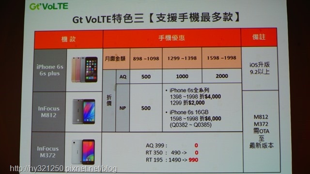 亞太電信Gt VoLTE服務的第三個特色,是支援iPhone 6與iPhone 6s系列的五支手機,加上Infocus M812(高階)與M372(低階)兩支Android手機,總共有7支手機可供選擇。