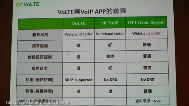 由於Skype、Line、VoIP提供的語音通話,一樣是使用網路封包傳輸方式,但跟VoLTE服務最大的差異,就是電信營運商會在自己的4G LTE網路中,切出專屬VoLTE服務基本頻寬,當判讀網路封包是屬於VoLTE服務的網路封包時,就走基本預留給VoLTE服務頻寬進行傳輸,原則上不會有像其它網路語音服務可能會遇到的網路延遲狀況發生,因此不管是語音品質、語音延遲、傳輸品質、撥通時間、耗電部分,VoLTE都會是最好的。