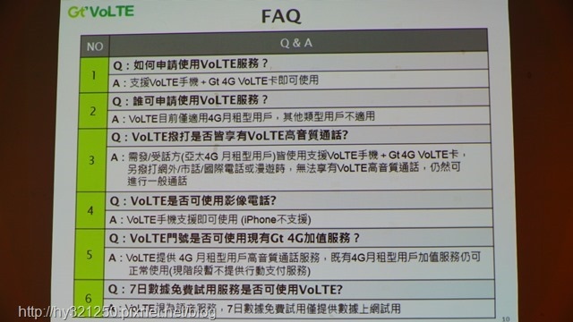 Jimmy最後藉由這張常見問題Q&A的投影片,說明申請自家Gt VoLTE服務時要注意的部分,以及目前在使用時的限制。主要來說,目前享受Gt VoLTE高品質語音或影像通話服務,雙方一定都要是亞太電信4G月租型用戶,Sim卡與手機(iPhone不支援影像通話)都支援Gt VoLTE服務,並且都在自家4G LTE網路涵蓋區域內才行。