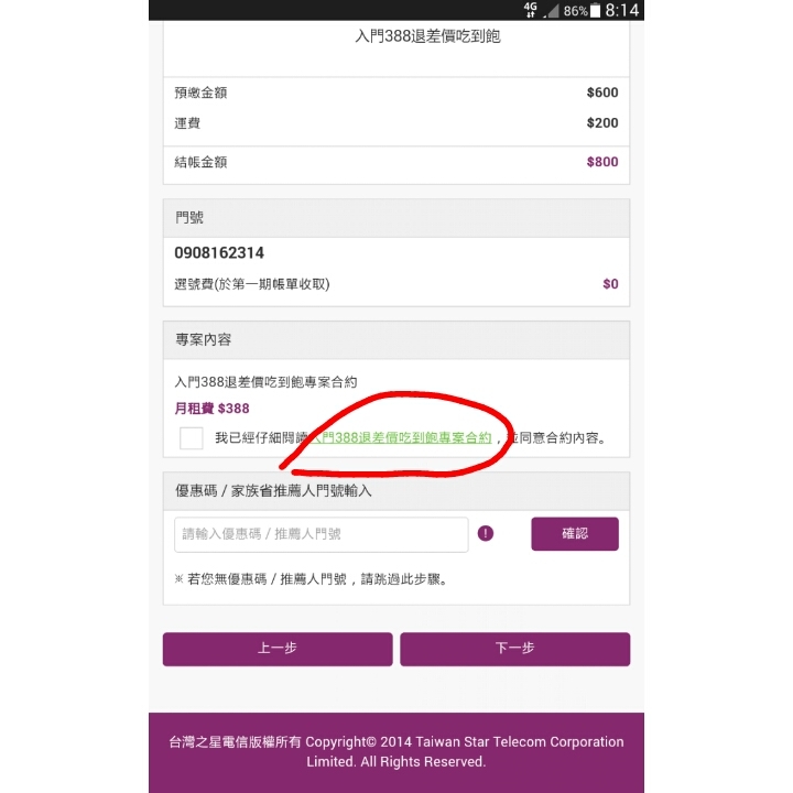 申辦4G $388單辦門號須綁約12個月且須預繳。