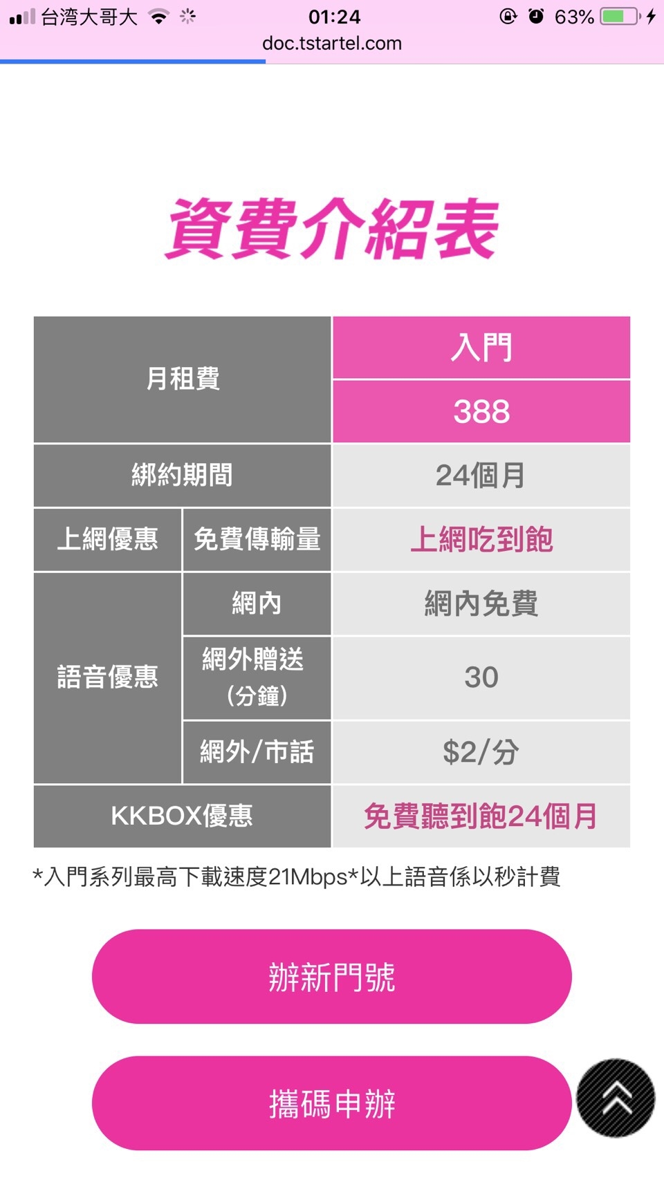 樓主既然來到 01,居然還跑到門市去辦?難道都沒有先爬文做功課嗎?台星除了雙 11 的 188特案吃到飽,其他時間要到通訊行辦折扣方案才會便宜。目前台星在推攜碼 488-24個月,限速 21M,網外送 40分,打超過或打市話都是 2元/分,市話沒有送。(這個方案比較經濟實惠,而且台星很多地方都跑不快,所以我個人覺得辦不限速方案沒多大的意義)很多店家折算後攜碼 488-24個月比 388-24個月還要便宜,所以要特別注意!!!(台中通路殺到每月 188,其他地區也只要 2百出頭而已)488-24個月網外送 40分,比雙 11 的 188 特案吃到飽送 20分還要多一倍。