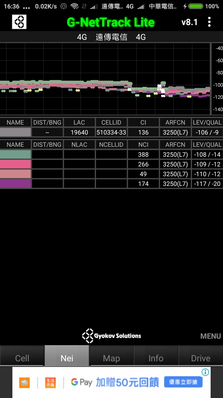 先用手機安裝 G-NetTrack Lite 去掃頻率,下面第二個選項 Nei 按下去,然後去看 ARFCN 那一格有沒有掃到 L7。L 代表 LTE,也就是 4G。7 = 2600(B7),高速基地台。如果有掃到的話,直接上蝦皮去買 B310AS-852【鎖頻版】,二手的就可以了,有二個賣家都殺到一千元以下了。PS.手機需要安卓 7 版本。
