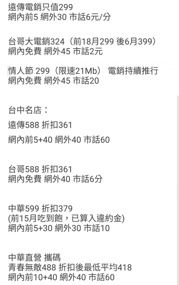 自我技術提升無上限...吧??? wrote:上面大大發的圖是一樣網路吃到飽+不降速(有多快用多快)?後面的折扣是什麼意思? 1.有出現折扣那二個字的,指的是通訊行的攜碼折扣方案。通訊行的攜碼簽長約+不拿手機 = 把手機賣回給通訊行,這樣通訊行就會退錢給你。2.上面那張圖片最下面的中華門市青春無敵 488 攜碼 418 是錯誤的,448 才對。攜碼可以第一年 -50,中華員工推薦新朋友第一年 -50,加起來每月 -100,所以第一年每月 -100 = 388。後面 18個月 488,這樣 30個月平均下來會是 448。請看下面圖片第一條和倒數第二條。
