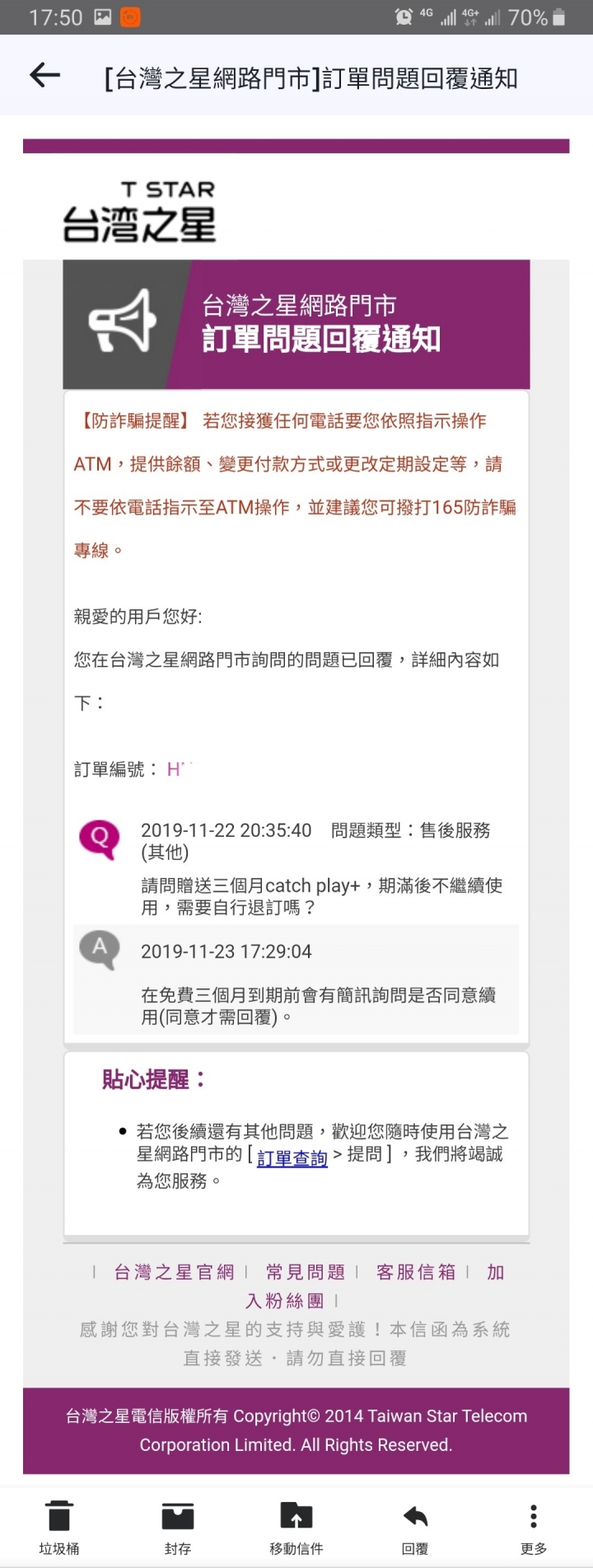 我猜很多人擔心自動申裝後3個月忘記取消會被收錢,所以有去跟台星抱怨