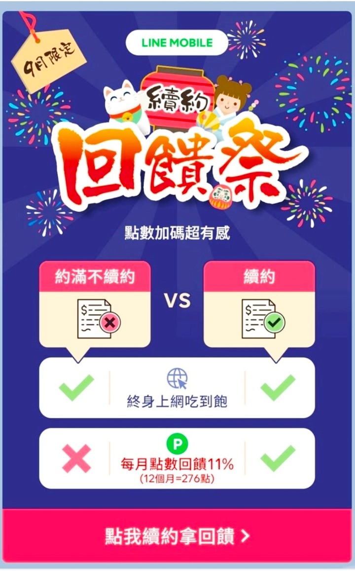 用Line帳號加入Line Mobile官方群並綁定(註冊)申辦的LM門號尤其LM211門號一定要綁定每月回饋的23點就是回饋到綁定門號的Line帳號有在用Line Pay的話,23點就等於23元也就是LM211的月租等於211-23=188元今年是8月就用Line通知LM用戶可以續約了續約也是用Line操作 (而不是用遠傳APP)