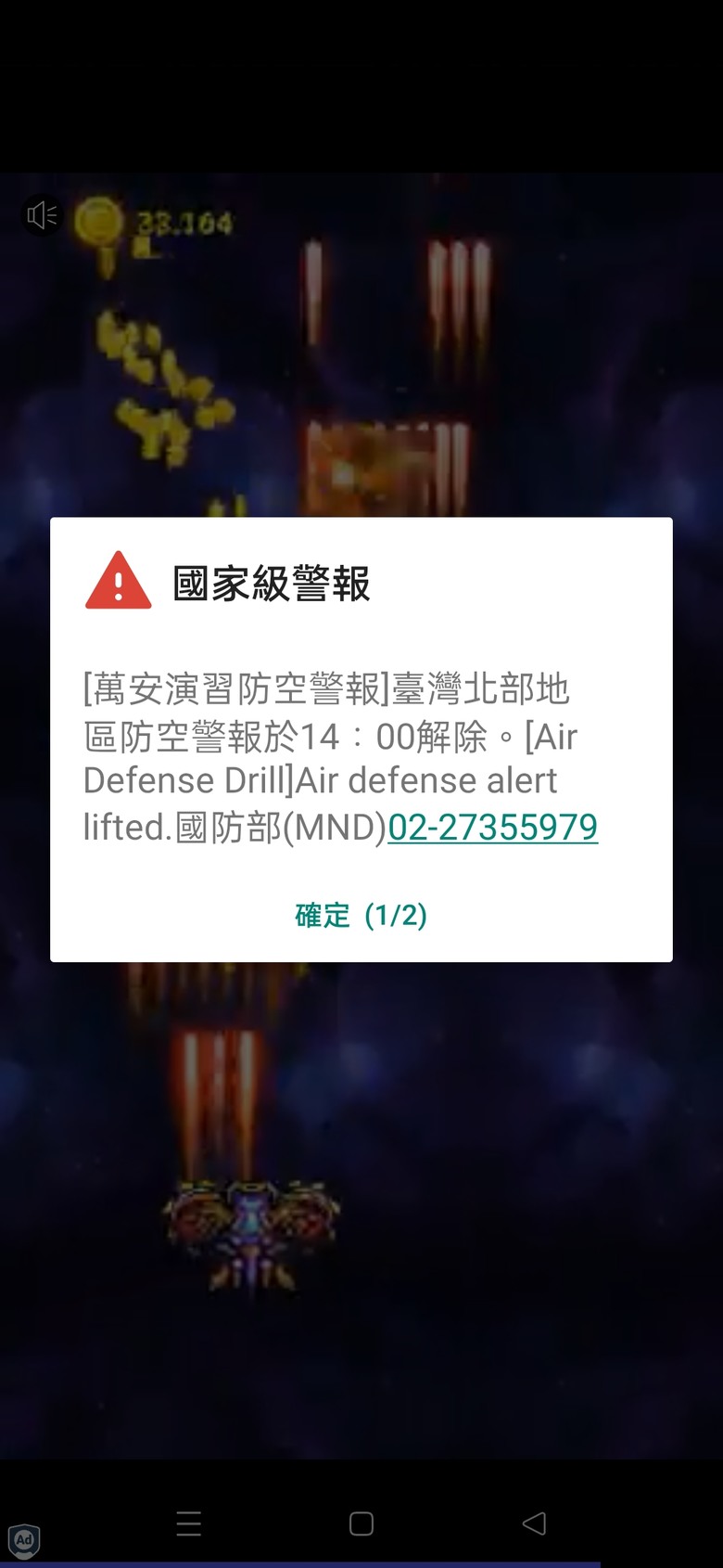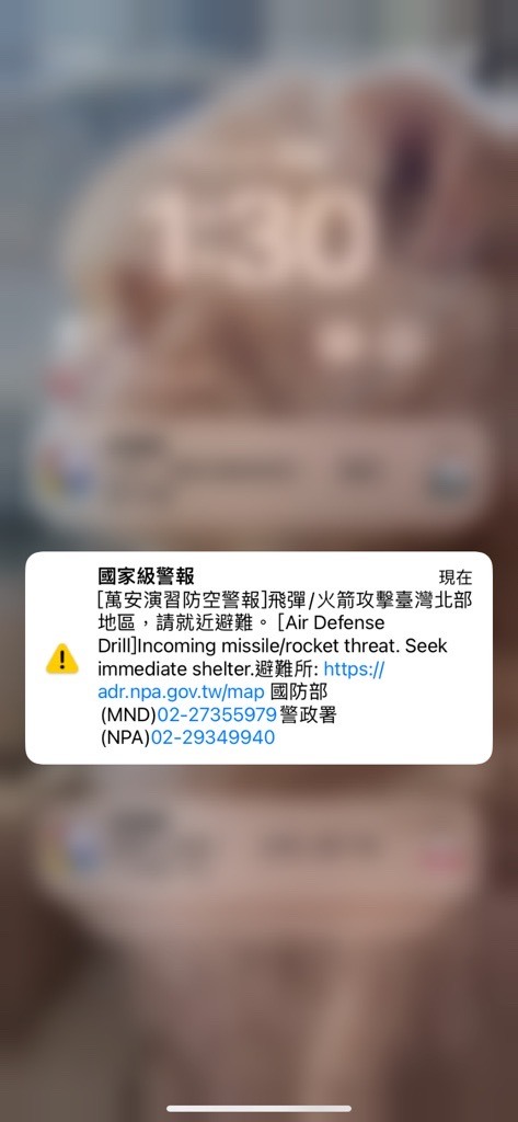 今天(23日)下午1時30分起至下午2時在北部7縣市實施萬安47號演習,包括宜蘭縣、基隆市、台北市、新北市、桃園市、新竹縣、新竹市。我居住宜蘭,門號遠傳電信 亞太電信;突然一響嚇到,以為要地震 ; 有人沒收到嗎?