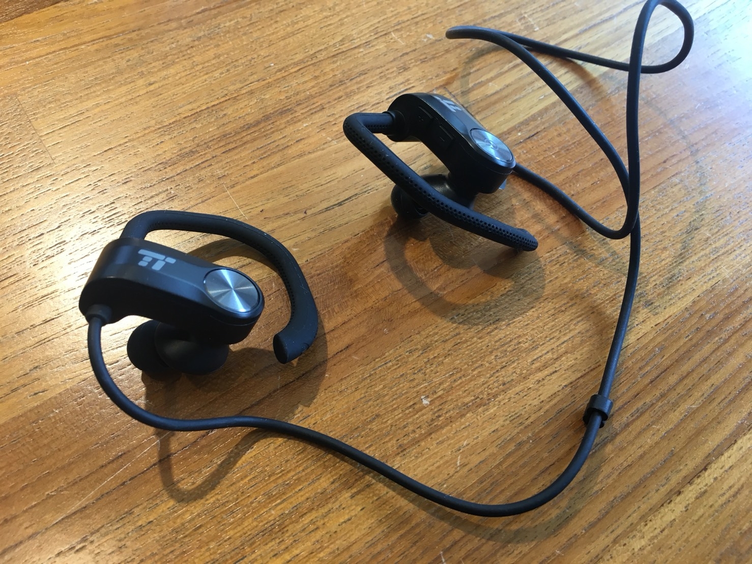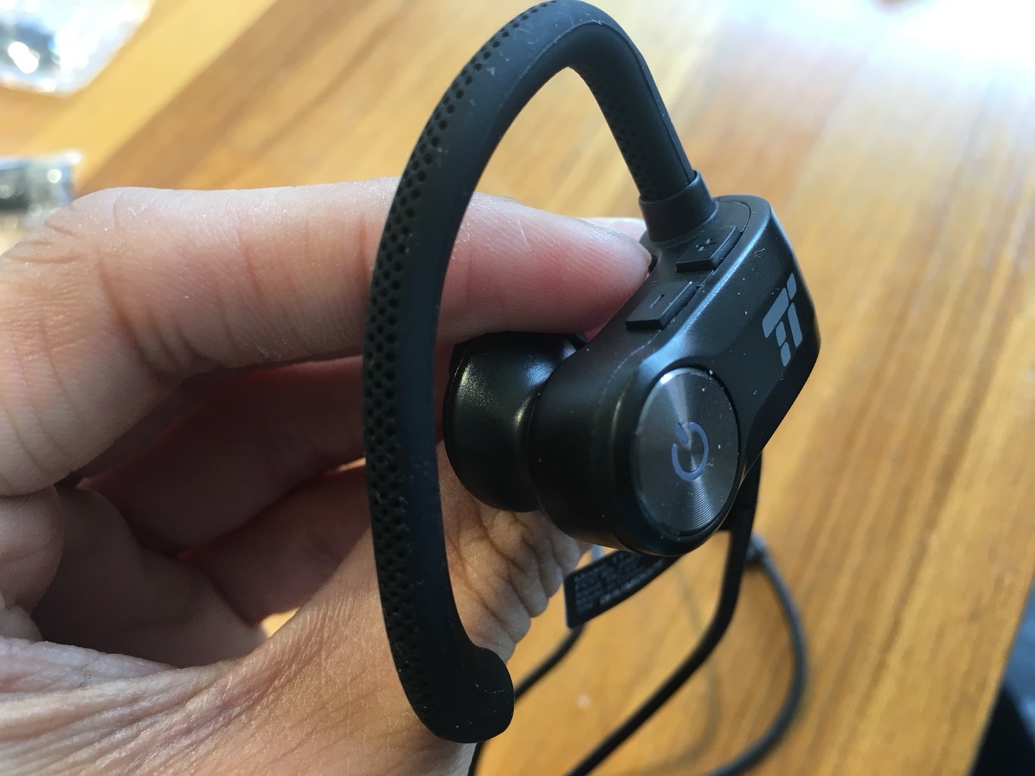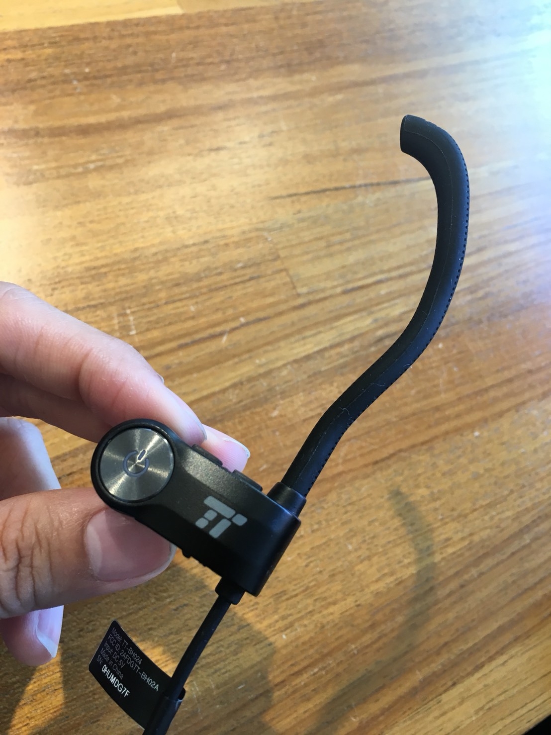 耳機本體是純黑色設計,正面印有TT LOGO,耳勾設計是這支耳機很不錯的設計。文案是寫360度響應式設計,我實際使用真的可以轉各種角度,非常方便。只要戴上耳機後,就可以依據我的耳型調整耳勾的形狀。這在我運動中的時候,給我很好的穩固性,不會因為跑步的晃動就搖晃產生聽診器效應。
