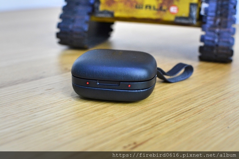 必須要蓋上充電盒上蓋後才會關機,並且開始充電,正面左右兩個紅色LED燈顯示耳機正在充電中。