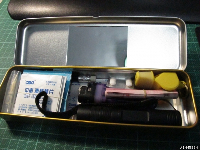 PSK(Personal Survival Kits)準備的差不多了1.LED AA手電筒x12.Fox 40 CMG哨子x13.打火機x14.酒精棉片x25.優碘棉片x26.3M OK繃x47.Condomx28.別針x49.鉛筆x110.防水紙x611.橡皮圈x812.鼻炎膠囊x213.新台幣$100x214.小鏡子x115.摩爾莊園鉛筆鐵盒x1(200mmx60mm)瑞士刀找不到