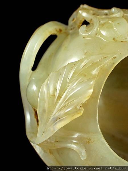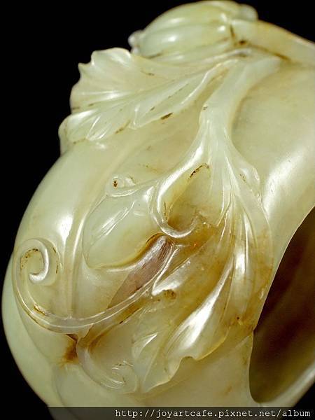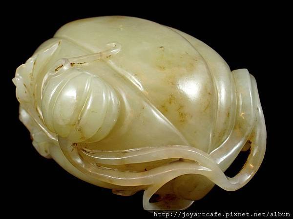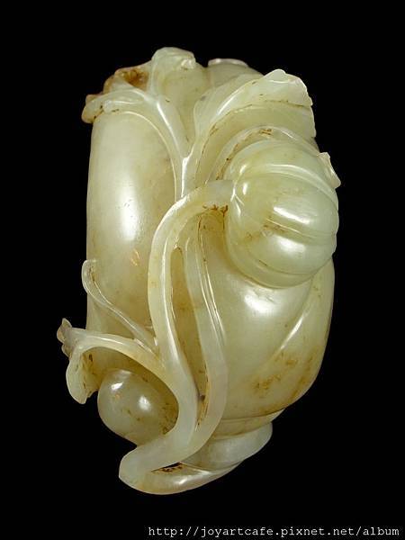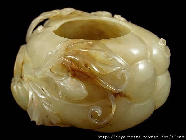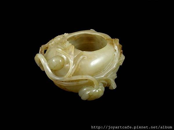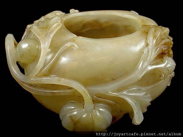 本件白玉瓜形筆洗,玉質本身帶有一些天然的石紋,外圍的雕工和內部的掏膛都十分講究,每一個角度,都能呈現出獨特的美感,玉雕師傅的功力可見一斑。