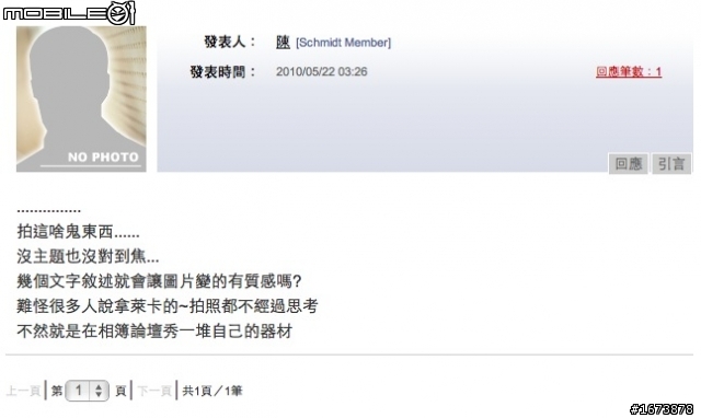 Oh My God ,原來這就是一顆 15萬的鏡頭在拍的東西耶,1. 完全不用對焦 2. 也不用泛焦 3. 也不會迷焦 4. 也不用主題 5. 也不用構圖。感覺好像在賣安全帽而不是在介紹鏡頭咧?而且也不是每顆安全帽都有在焦點內哦!真是無言阿。難怪現在用徠卡都給人冠上錢多金的少爺小開潘仔在用的,因為會這樣稱呼他們,就是因為看到類似這樣的作品而產生這樣的聯想是嗎?嘆現在徠卡已淪為這樣的評價....。還是說隨便拍一拍之後,文章夠會掰,掰的有哲學意念就行了?真是現在普遍有趣的徠卡現象呀。