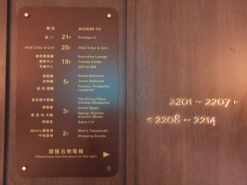 我們這次是入住22樓的經典客房,電梯旁的清楚標示了各樓層的設施與位置。