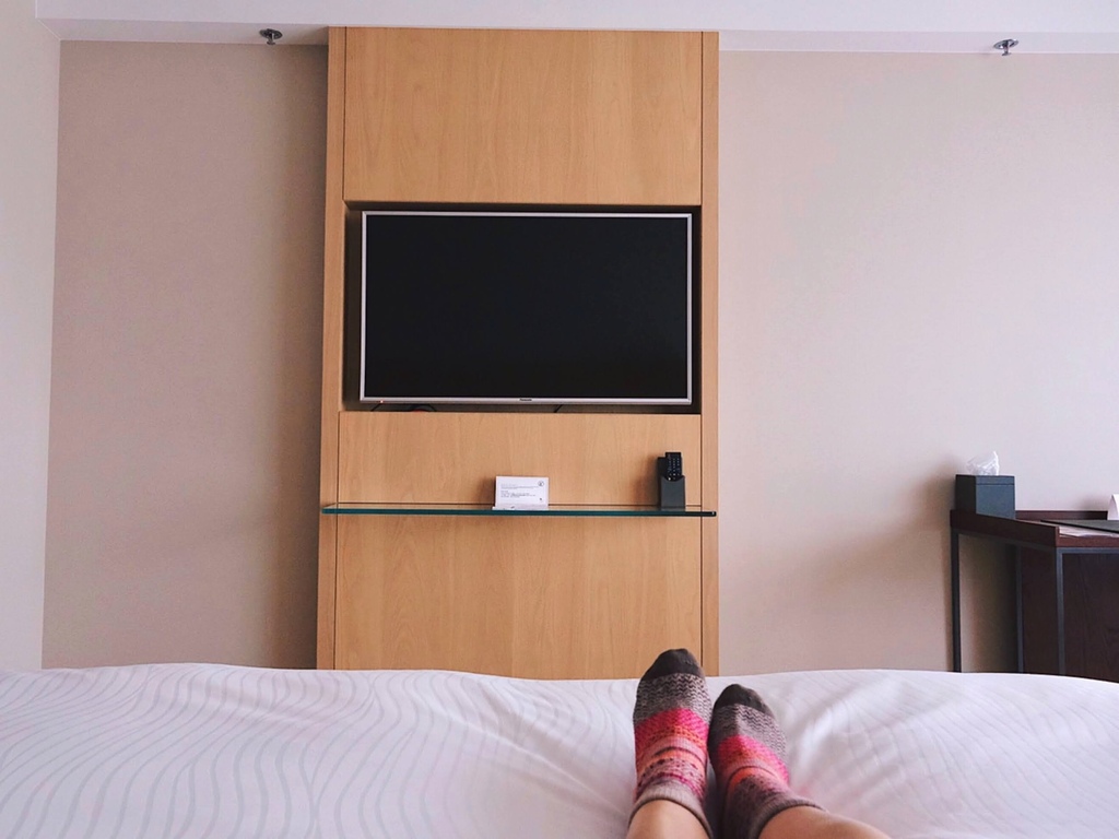 雙人床正前方就是50吋液晶電視,晚上邊看電影邊吃零食就很享受了,床鋪的部分也很舒適,當晚睡得很不錯。