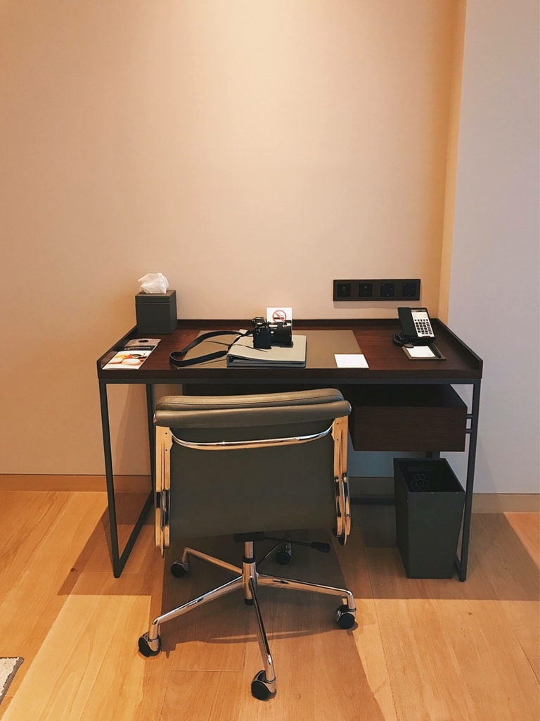 液晶電視旁是一張辦公桌椅,除了有一般的紙筆、電話、飯店簡介和提供的各式服務資訊,