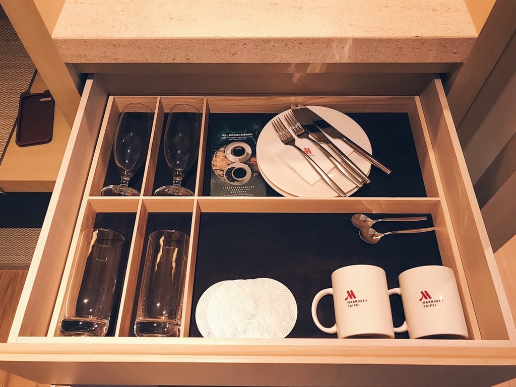下方的餐具組除了刀叉餐盤外,還有多種飲品杯具,就算點Room Service也不用擔心。