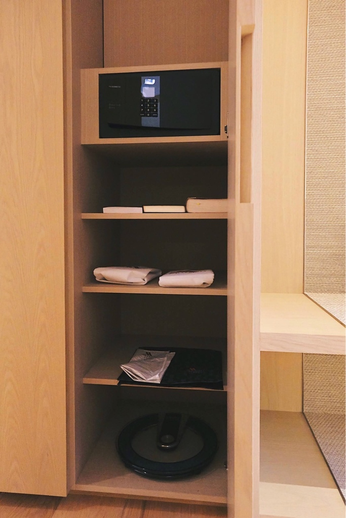 過了mini bar後面有塊放行李和鞋子的空間,旁邊的櫥櫃放置了密碼保險箱、聖經、洗衣袋和體重機等等,