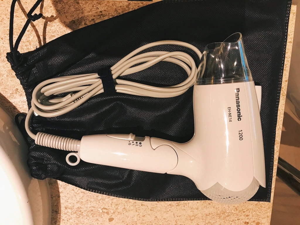還有Philips飛利浦吹風機,下方一格一格擺放了盥洗備品,從牙刷牙膏、仕女包、梳子、刮鬍刀、浴帽等等都有。