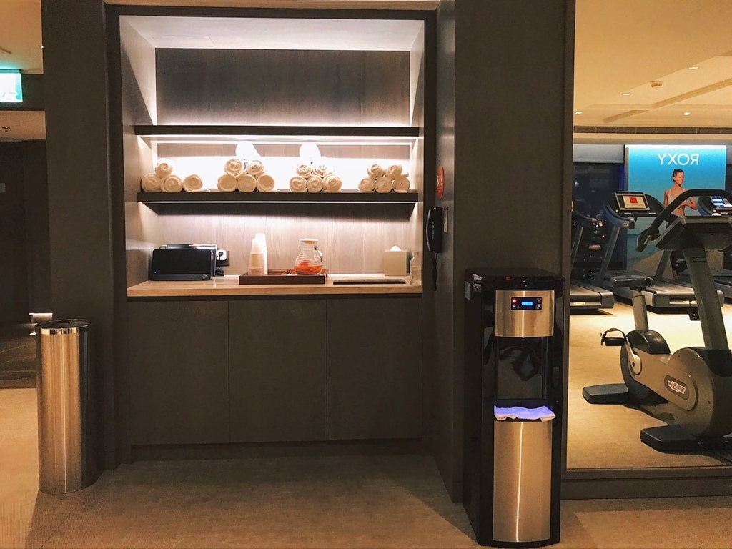 健身中心入口兩側放置了運動備品,例如:毛巾、飲水機、雜誌、瑜珈墊、紙杯和水等等供大家取用。