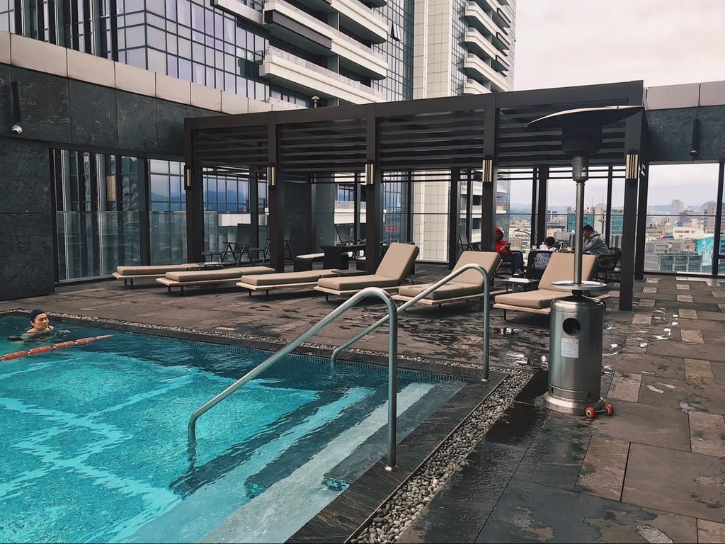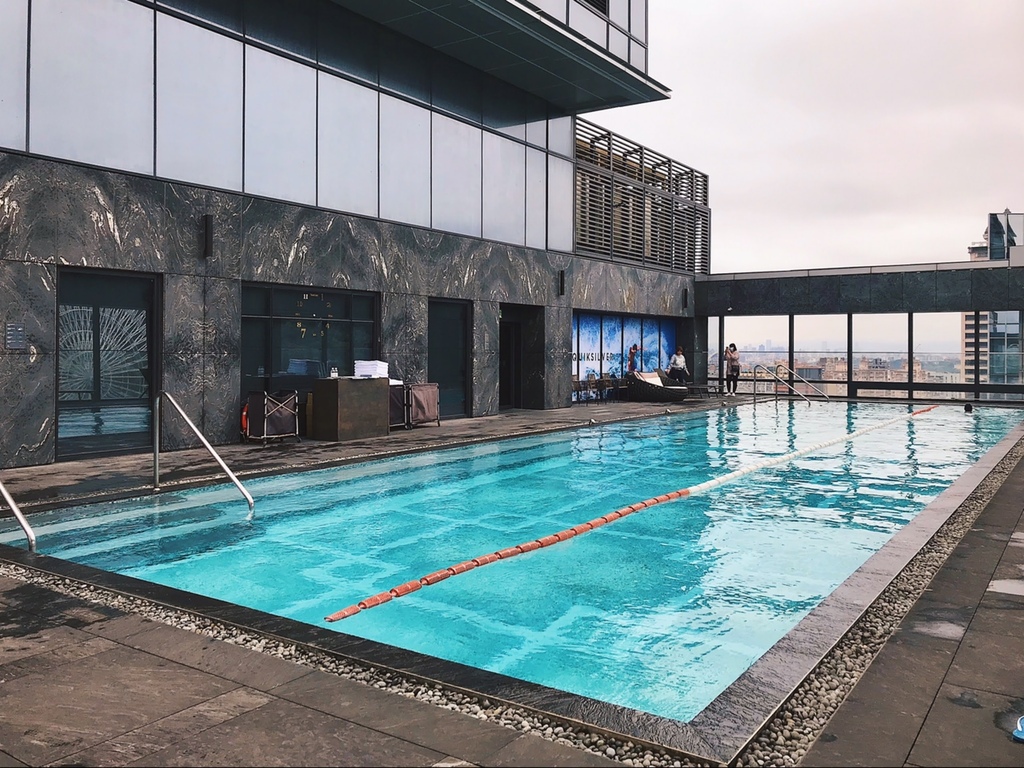 19樓櫃台左手邊是SKY19 SPA,右手邊是健身中心,再往後面走是露天溫水游泳池。