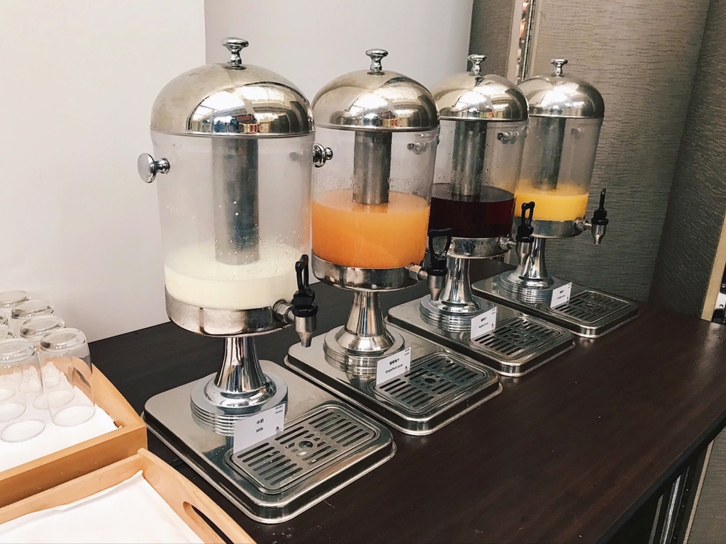 旁邊的飲品區,有牛奶和各種現打果汁,兩個鐵壺裡頭有熱美式咖啡和熱茶,如果想喝不同口味的咖啡,可以到Garden Kitchen使用咖啡機。