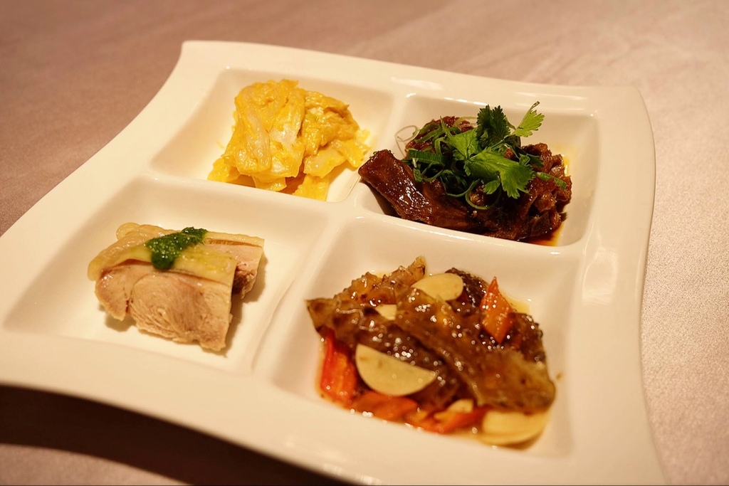 第一道「萬豪前菜集」是由四道拼盤組成,分別是黃金泡菜、辣滷鴨翅、涼拌魚皮和椒麻醉雞,