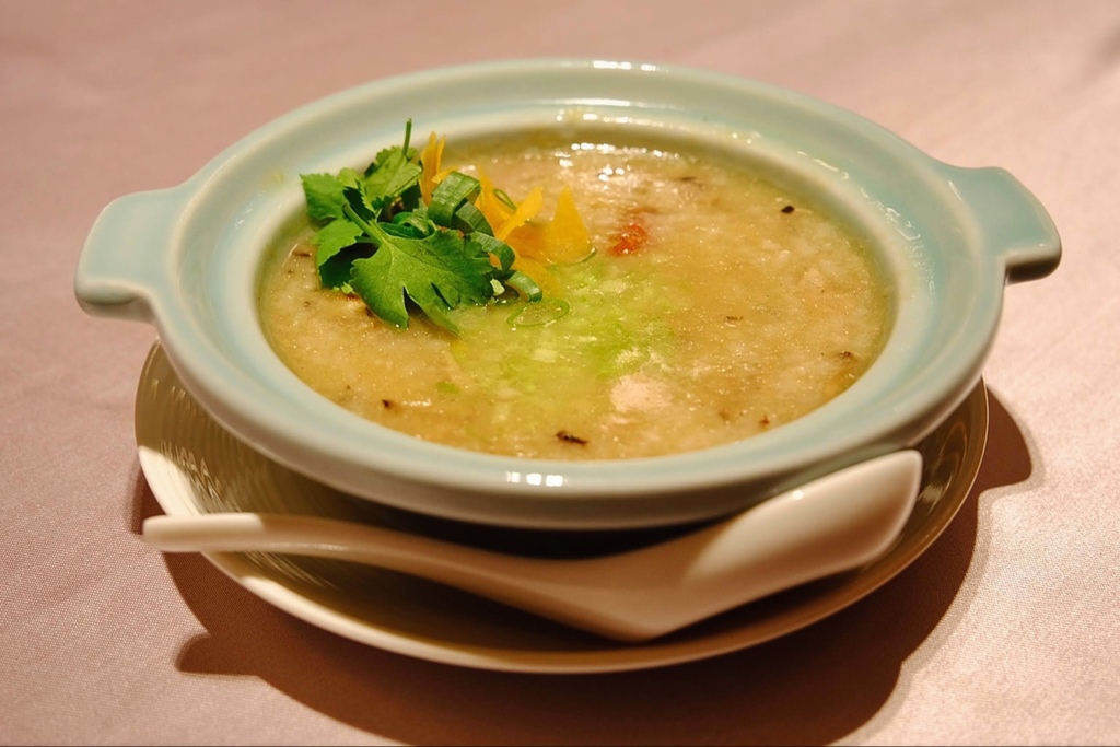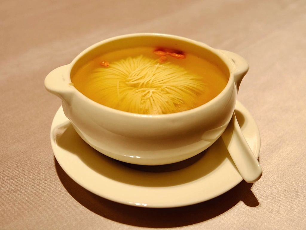 「錦繡菊花清雞湯」裡頭飄著的是切成細絲的菊花豆腐,湯底是由老母雞、豬後腿肉和京華火腿燉煮八小時的港式上湯。