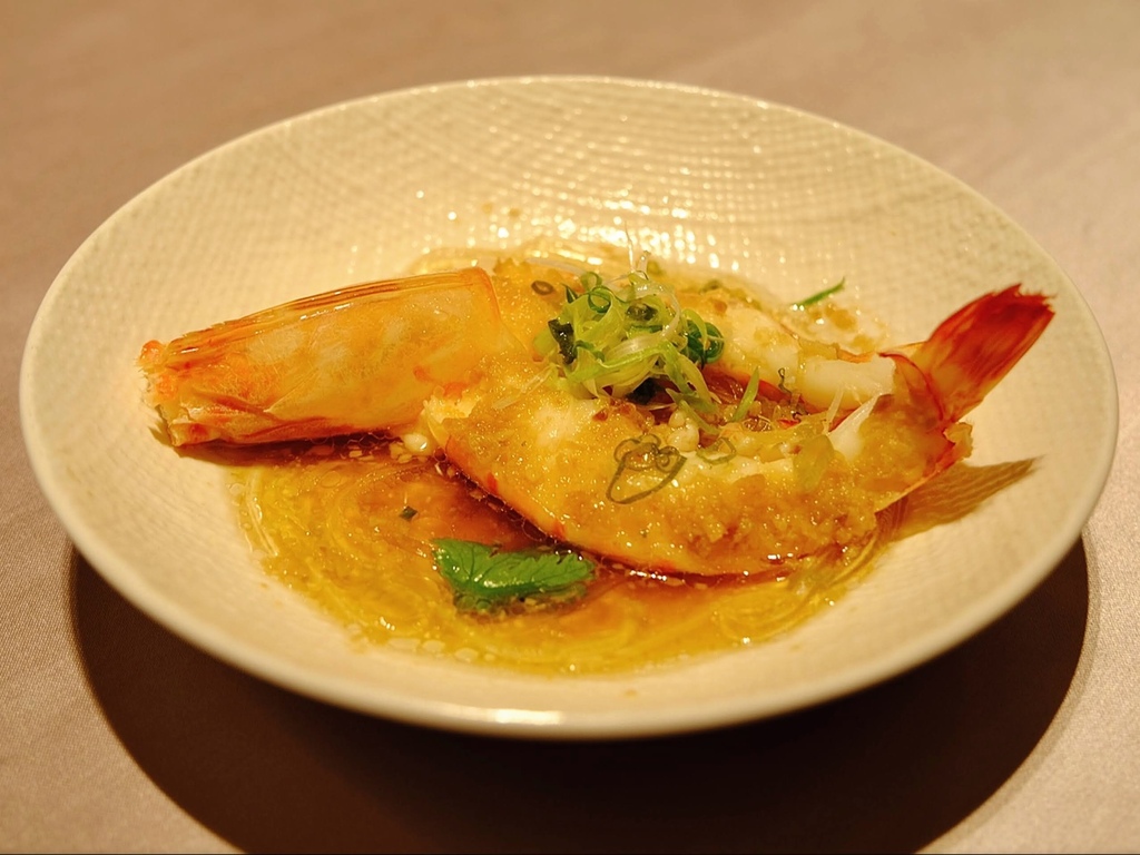 「蒜香葛粉蒸明蝦」中新鮮的蝦子已經被處理的殼肉分離,並吸飽了蒜香濃郁的醬汁,搭配葛粉一起食用,讓人一不小心就光速完食。