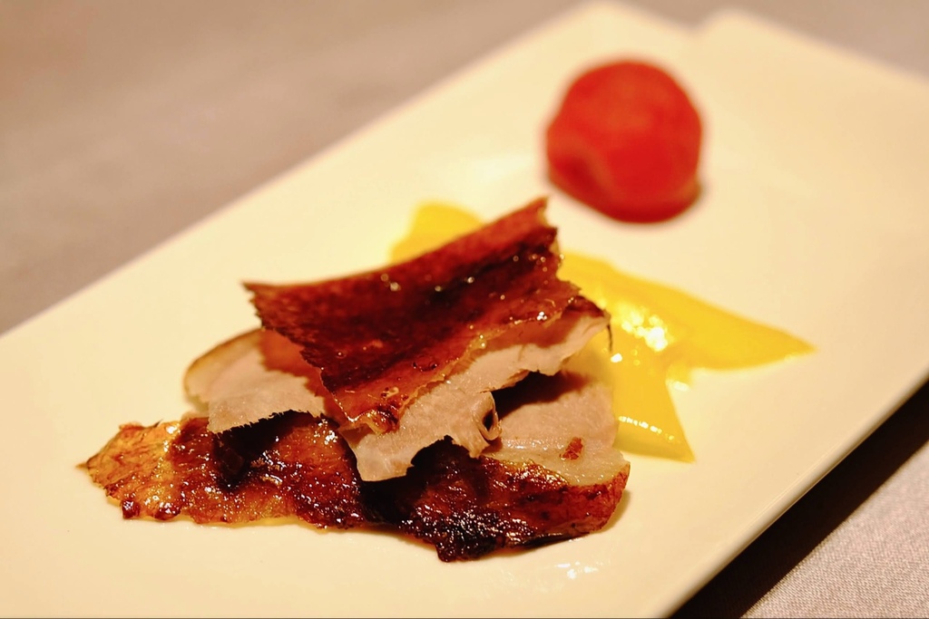 片好的鴨皮金黃薄脆,儘管富含油脂但配上下面的鴨肉和甜麵醬,同樣讓人火速完食,一旁的醃漬果物也能適時解膩。