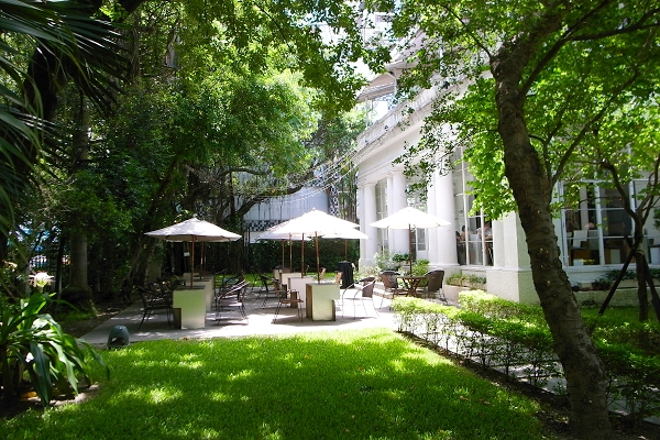 館外庭園綠樹成蔭、充滿涼意,在白色主建築襯托下,連戶外的咖啡座,也充滿詩意,展現一副文藝氣息。來此人員不多的時候,園區看來相當舒服,真是個不滿綠意、迷人的空間。