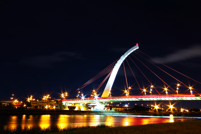 大直橋,橫跨基隆河,第一代水泥橋於民國50年啟用,是內湖大直地區通往台北市區的捷徑。後來,內湖大直地區人口遽增,交通往來頻繁,舊大直橋已經不堪負荷。造型特殊的第二代大直橋,於民國91年改建完工,成為全世界首座釣竿式斜張橋。歡迎大家來【美麗夜景】台北大直橋,繼續欣賞,謝謝。