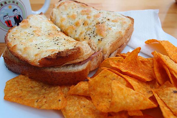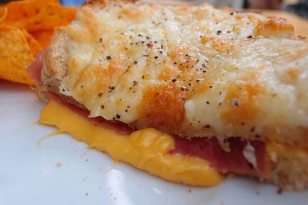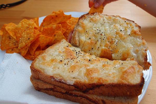 兩大片全麥吐司夾有起司火腿內餡,搭配焗烤外層,好美味^O^