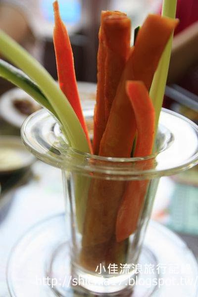這春捲不是台灣傳統的春捲,他用蝦醬包在春捲裡,包得長長的炸。和芹菜、小黃瓜、紅蘿蔔放在一起,第一次吃到這種形狀的春捲。