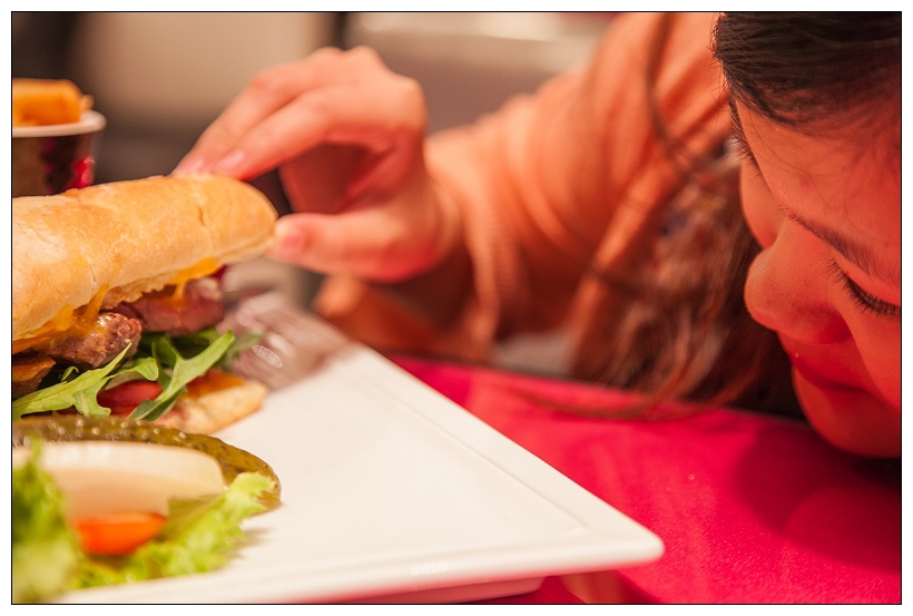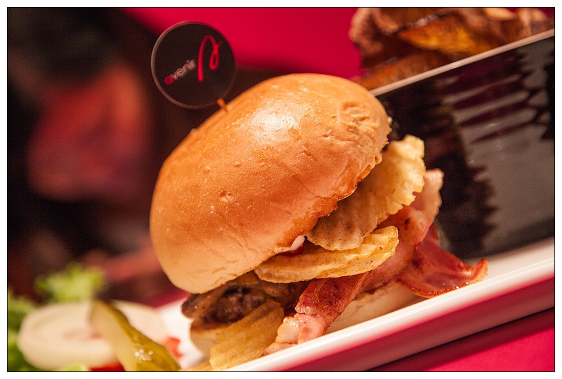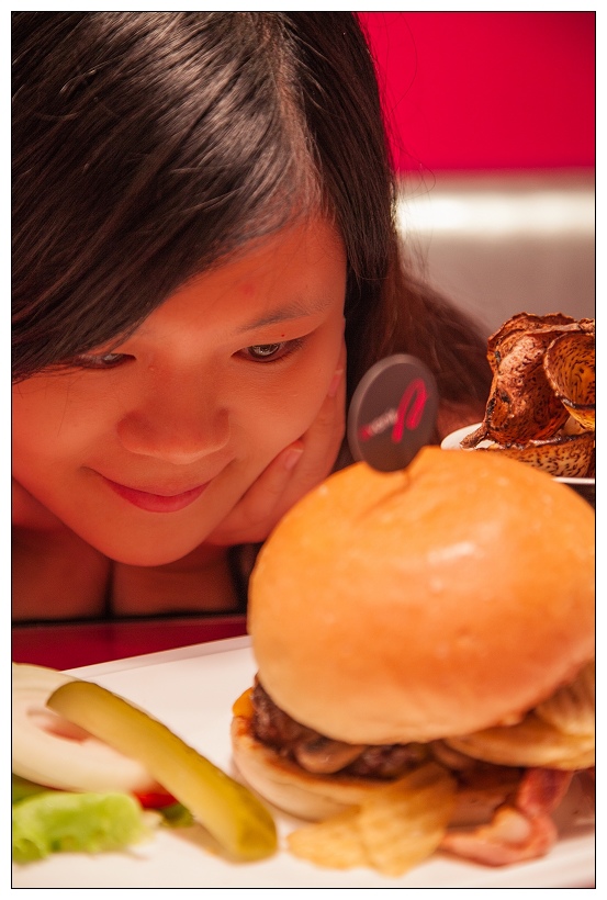 漢堡內有蘑菇、洋蔥、整條培根、洋芋片以及