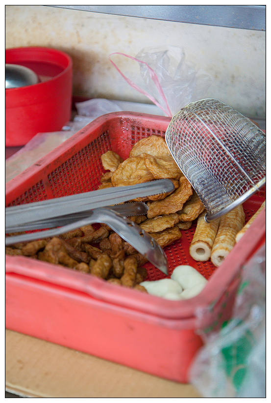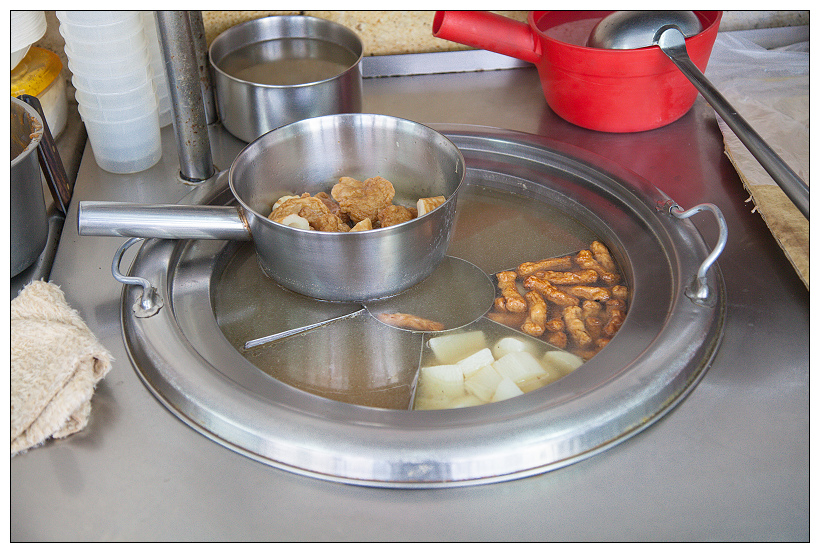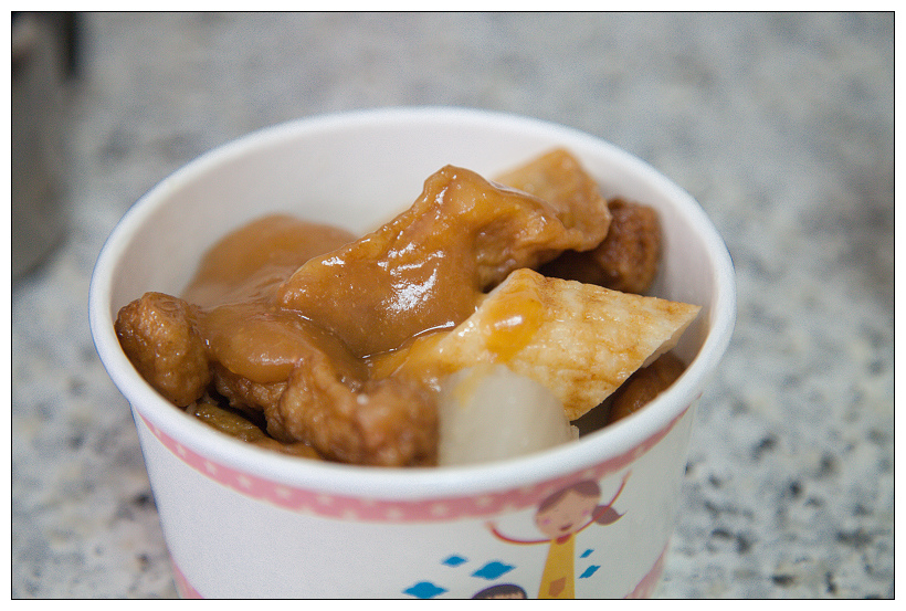 甜不辣就是綜合的關東煮,有黑輪及白蘿蔔等,,若有不愛的都可以跟老闆反應替換別的,上面淋的醬料偏甜,栗不太喜歡這種醬料因此都會撥掉,但奇怪的是吃完的甜不辣碗沾點這種醬再去添湯就很好喝。米糕NTD40的部分有肉片、蛋以及香菇等,台西港的米糕不會特別令人驚艷,就是想吃米糕時來點也不會覺得難吃。