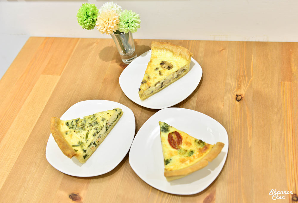 半乾番茄乳酪鹹派 90元、田園野菇鹹派 100元、鄉村風味鮭魚波菜鹹派 100元
