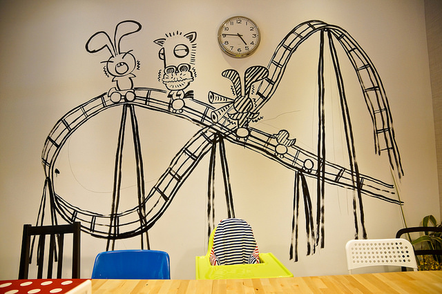 牆面上是老闆娘自己塗鴉繪畫的遊樂設施呢 超可愛的