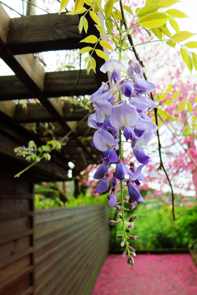 我永遠無法忘懷這透光紫藤!超大棵緋寒櫻,一地落英繽紛,為紫藤鋪上了柔美紅地毯……