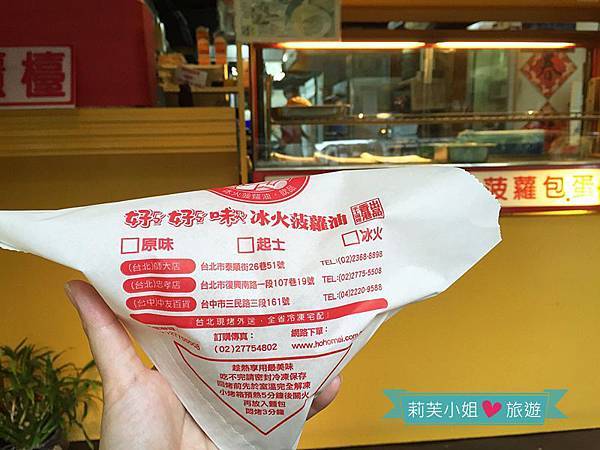 沒多久,店員就將肥胖飽滿的菠蘿包放在架上降溫,接著就將包裝好的冰火菠蘿油送到我們手上。