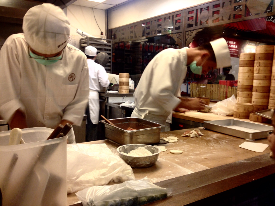 點水樓的一方也有透明的櫥窗可以觀賞到廚房的小籠包作業,一個人擀麵、一個填充餡料、兩個包,小籠包尺寸看起來雖不大,每一顆都挺挺的,上方的小圓洞完整。