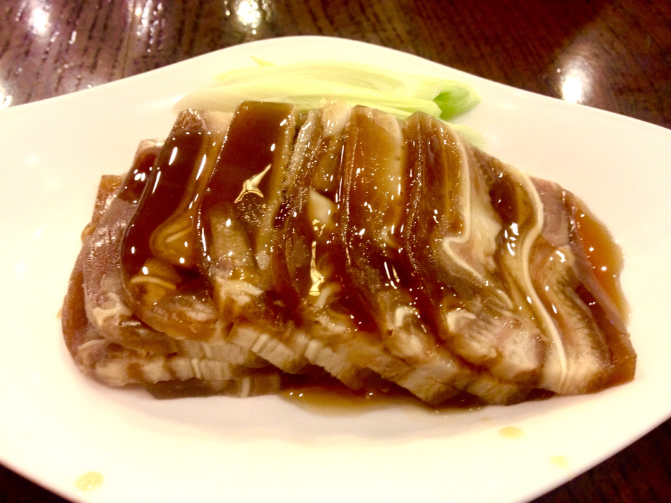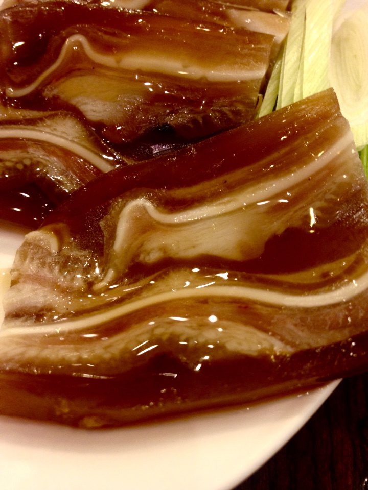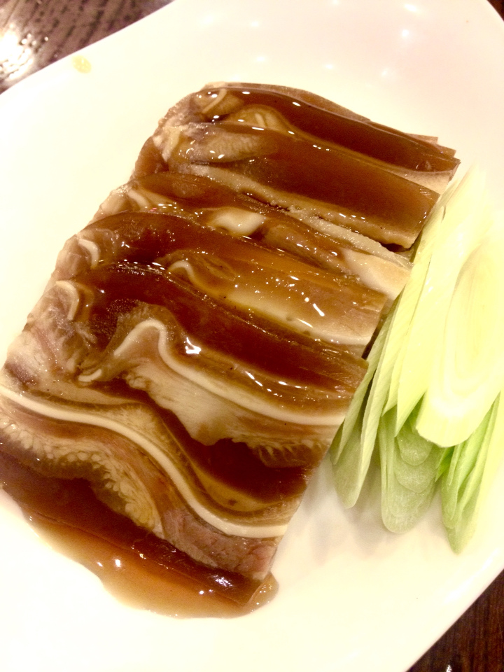 另外在小菜的地方挑了看起來膠質很豐富的千層風(NTD90)豬耳朵,豬耳朵在湯汁裡面塑形後、切成一片片薄片,每一片都有大理石般的紋路、以及光澤,是豬耳朵的創意料理:D 這裡要特別說一下它上面淋的麻油,超級濃郁。