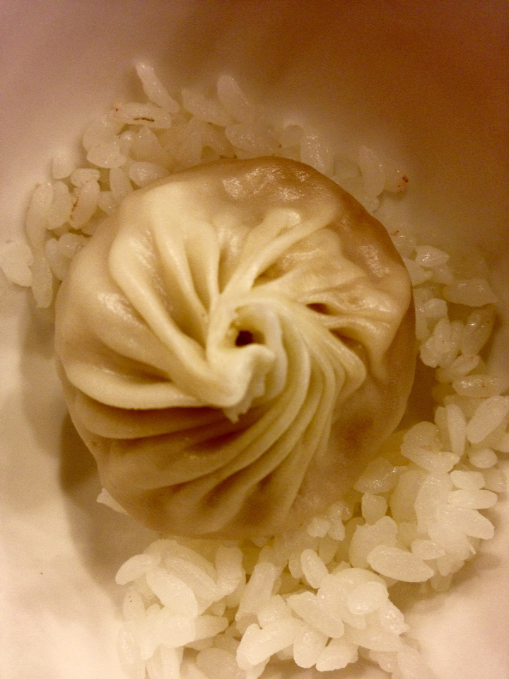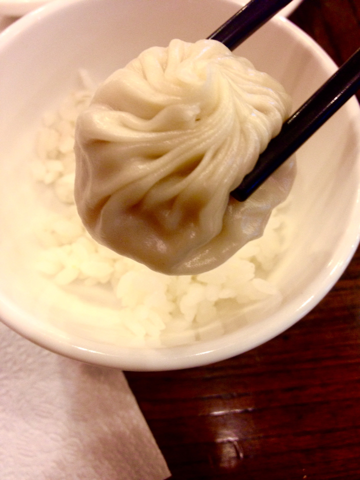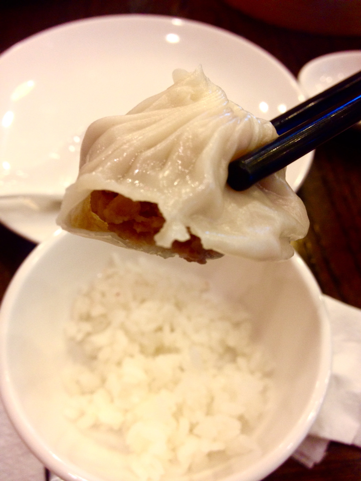 鮮肉小籠包5pcs( NTD110) 本日重點來了(完全背離原本要吃炒飯的初衷,改點水樓的小籠包了XD 5pcs真的只有貴一個字可以形容,但等著看後面介紹一顆NTD45的奶皇玉露包吧), 夾起來小破小洞喝湯,看他皮有多薄?