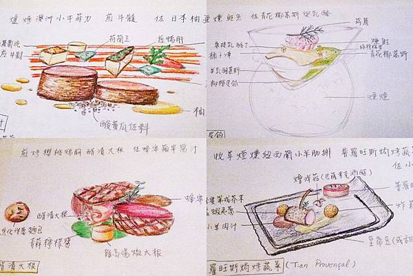 主廚的菜單手稿,原來主廚除了是拿過金牌、曾在米其林三星餐廳掌廚的廚師外,也是一位具有美感的畫家
