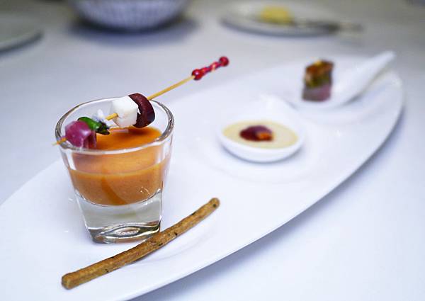 開胃菜: 瑪格莉特、馬扎瑞拉起司、聖女番茄和羅勒葉打成湯汁,它配迷迭香的餅乾