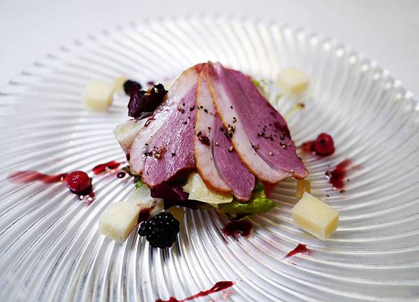 鴨胸沙拉,由西班牙羊乳酪、鴨胸和莓果組成,佐波特酒醬汁