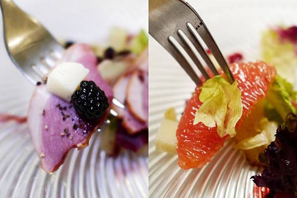 鴨胸口感軟嫩,它配莓果和新鮮葡萄柚果肉,非常清爽開胃